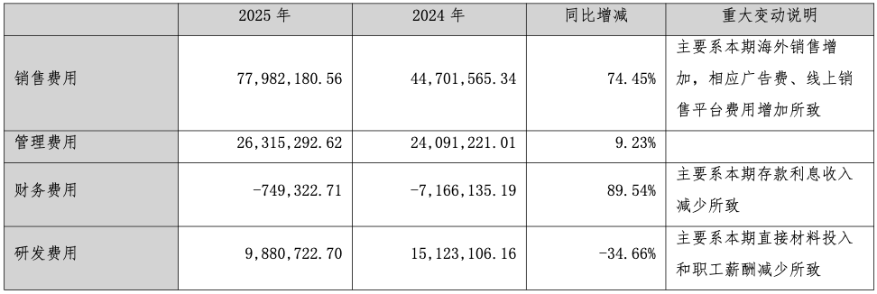 报告期内,公司销售费用同比增长74.45%,主要系本期海外销售增加,相应广告费、线上销售平台费用增加所致。财务费用同比增长89.54%,主要系本期存款利息收入减少所致。研发费用同比减少34.66%,主要系本期直接材料投入和职工薪酬减少所致。