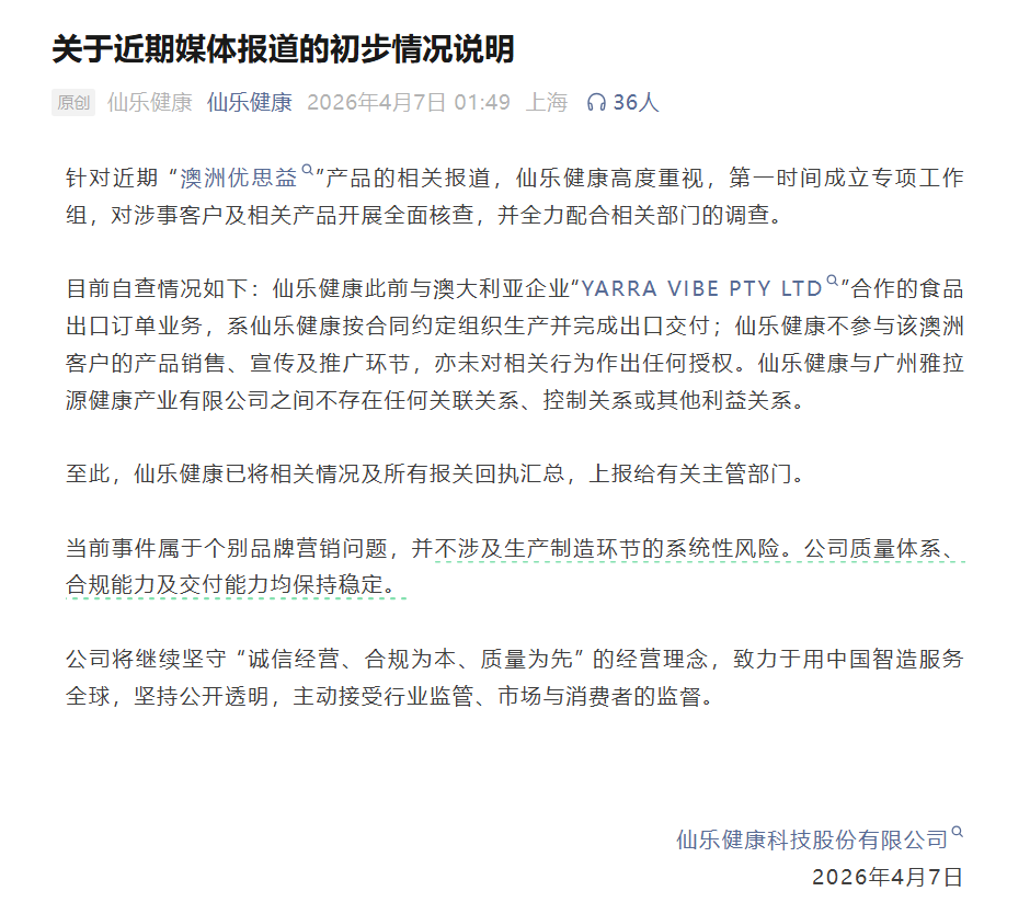 4月7日,仙乐健康官方微信公众号针对近期“澳洲优思益”产品的相关报道进行情况说明,称当前事件属于个别品牌营销问题,并不涉及生产制造环节的系统性风险。同时,仙乐健康也公布了企业自查情况,明确表示不参与该澳大利亚客户的产品销售、宣传及推广环节,亦未对相关行为作出任何授权。