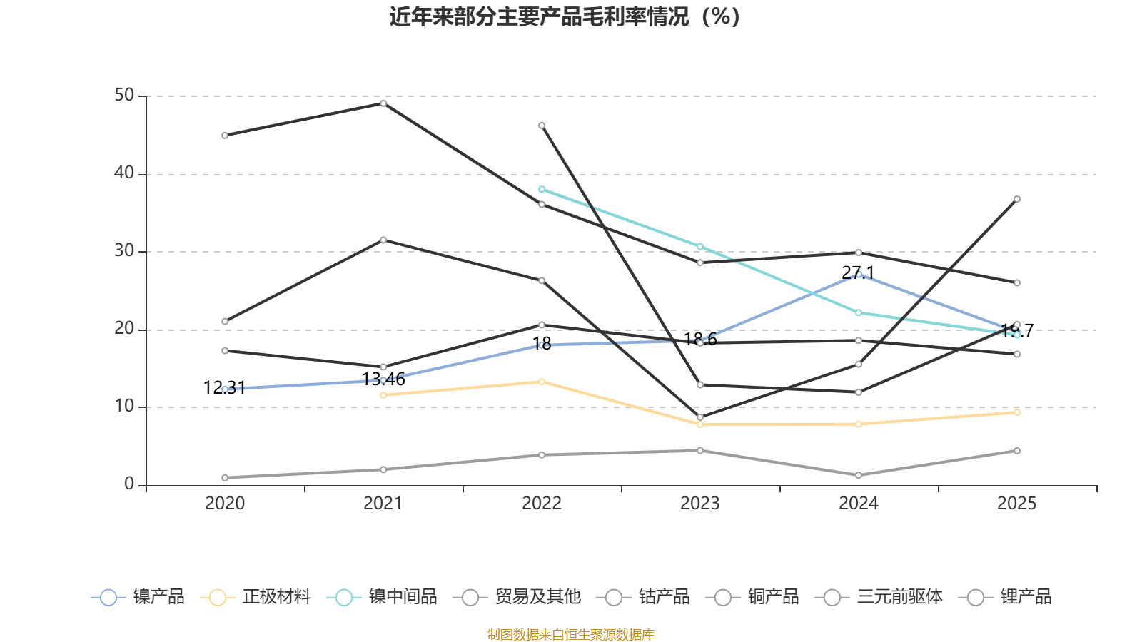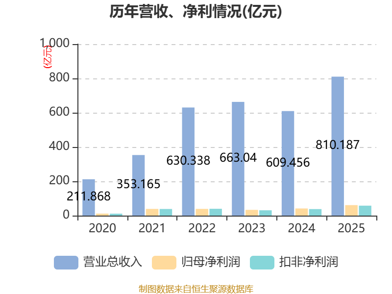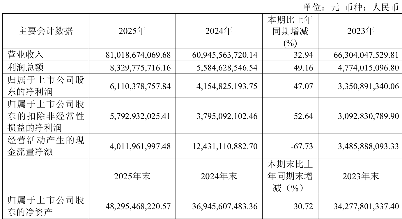 中证智能财讯华友钴业(603799)4月8日披露2025年年度报告。2025年,公司实现营业总收入810.19亿元,同比增长32.94%;归母净利润61.1亿元,同比增长47.07%;扣非净利润57.93亿元,同比增长52.64%;经营活动产生的现金流量净额为40.12亿元,同比下降67.73%;报告期内,华友钴业基本每股收益为3.34元,加权平均净资产收益率为13.70%。公司2025年度分配预案为:拟向全体股东每10股派现5元(含税)。