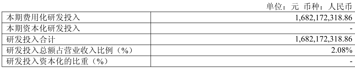 2025年全年,公司研发投入金额为16.82亿元,同比增长29.38%;研发投入占营业收入比例为2.08%,相比上年同期下降0.05个百分点。此外,公司全年研发投入资本化率为0%。