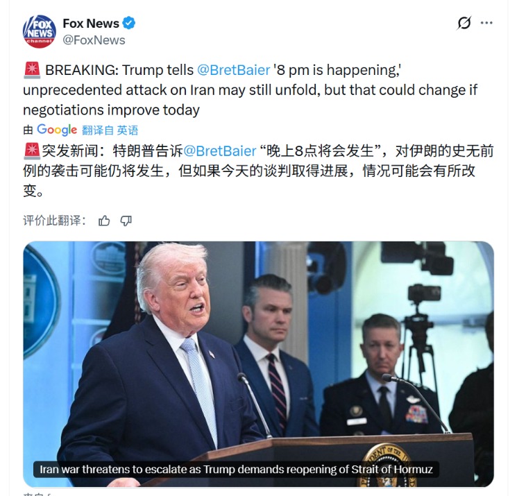 紧接着福克斯又有新消息,特朗普告诉福克斯新闻主播布雷特·拜尔,“晚上8点这件事照常进行”,针对伊朗的前所未有打击仍有可能发生;但如果今天谈判出现进展,这一情况也可能改变。