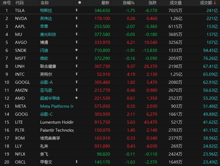 第2名英伟达收高0.26%,成交221亿美元。日前券商KeyBanc表示,Rubin量产进程受HBM供应瓶颈影响,仍维持英伟达“增持”评级。