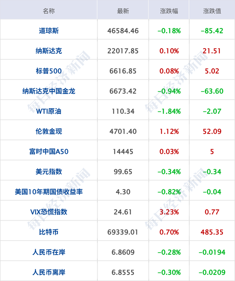 美股三大指数收盘涨跌不一,纳指涨0.1%,标普500指数涨0.08%,道指跌0.18%,其中,纳指和标普500指数录得四连涨;科技股涨跌互现,博通涨超6%,英特尔涨超4%,西部数据、谷歌涨超2%,苹果跌超2%,特斯拉、甲骨文、高通跌超1%。中概股多数下跌,纳斯达克中国金龙指数跌0.94%,阿特斯太阳能跌超5%,老虎证券、禾赛科技、阿里巴巴跌逾2%。