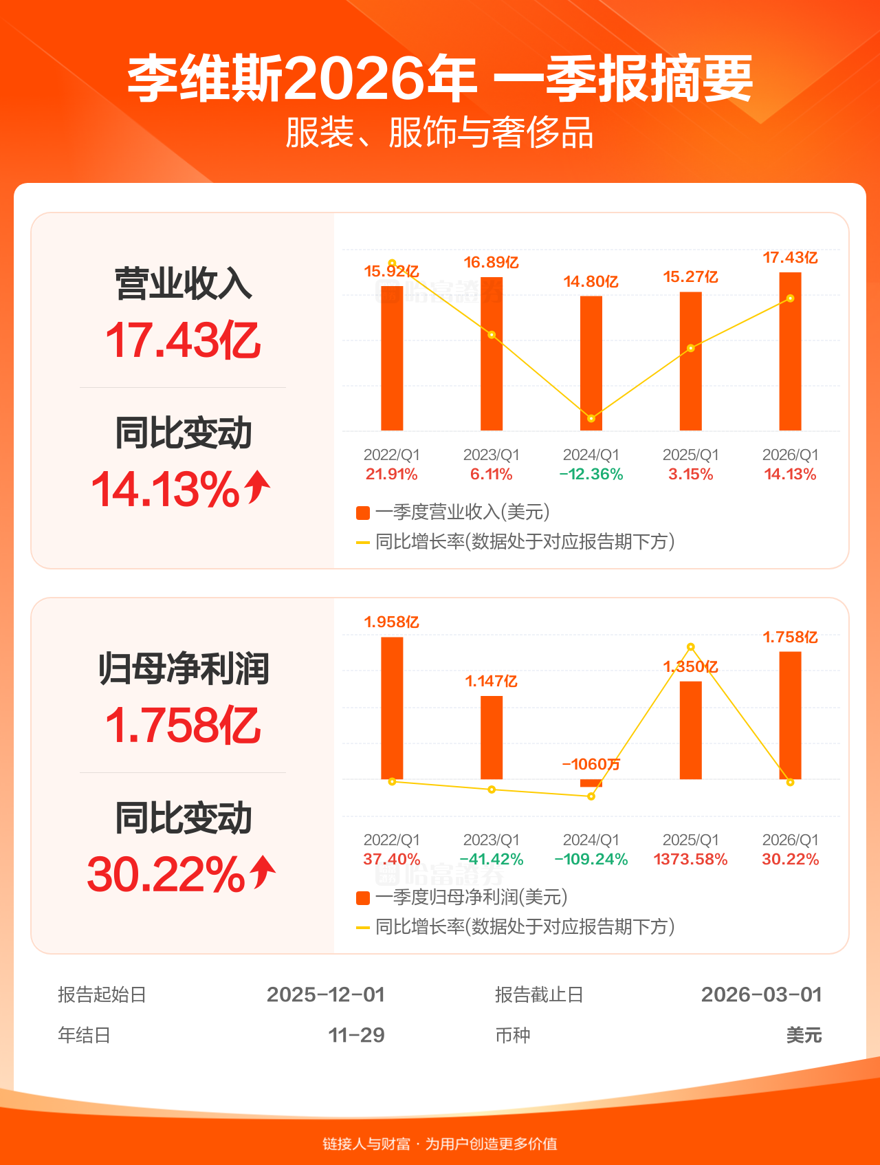 李维斯4月7日发布一季报业绩,截至2026年3月1日的3个月内,该公司营业收入17.43亿美元,同比增长14.13%;公司权益持有人应占溢利(归母净利润)1.76亿美元,同比增长30.22%。