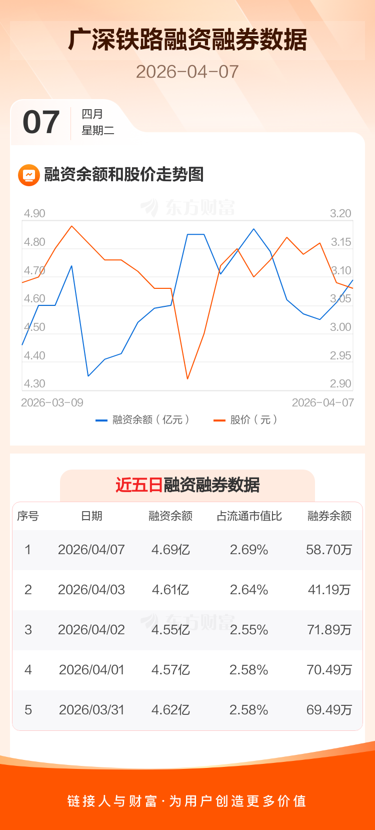 交易所最新数据显示,广深铁路于2026年4月7日获融资买入1919.32万元,融资偿还1156.90万元,当日融资净买入762.43万元。目前,该股融资余额4.69亿,占流通市值比例为2.69%。