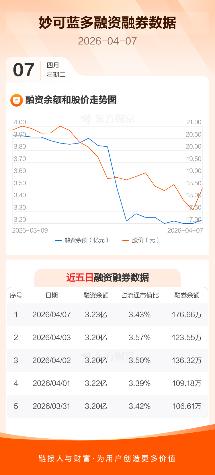 交易所最新数据显示,妙可蓝多于2026年4月7日获融资买入2114.00万元,融资偿还1759.10万元,当日融资净买入354.9万元。目前,该股融资余额3.23亿,占流通市值比例为3.43%。