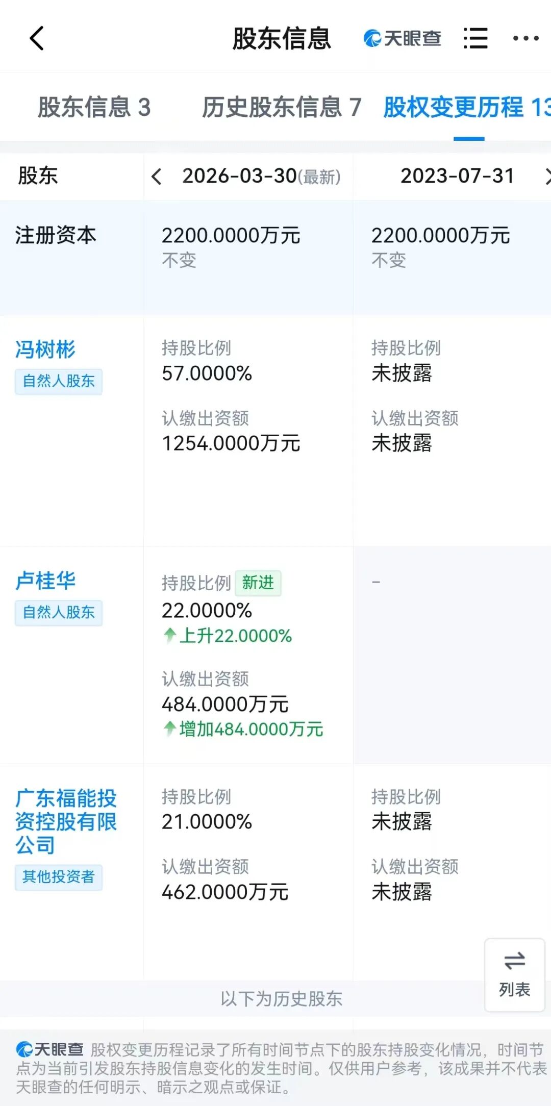 从广州烽云股权结构来看,黄晖持股比例为22%,且“工商变更资料已提交”。据天眼查披露,截至2026年3月30日,广州烽云最新的一条股权变更显示,自然人卢桂华以认缴出资额484万元新进广州烽云股东榜,持股比例恰为22%。