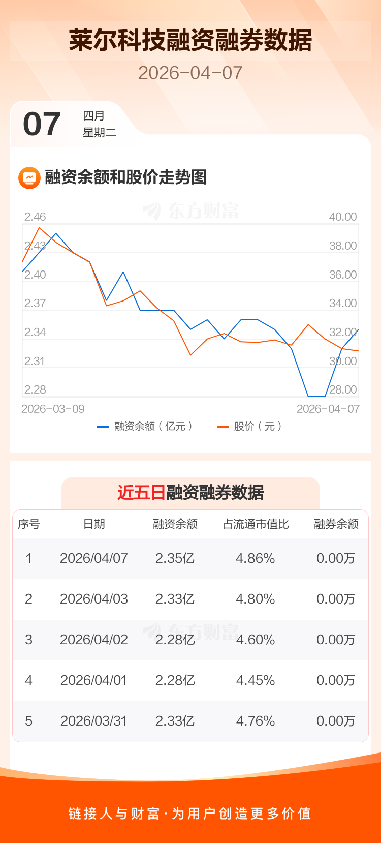 交易所最新数据显示,莱尔科技于2026年4月7日获融资买入466.55万元,融资偿还322.29万元,当日融资净买入144.26万元。目前,该股融资余额2.35亿,占流通市值比例为4.86%。