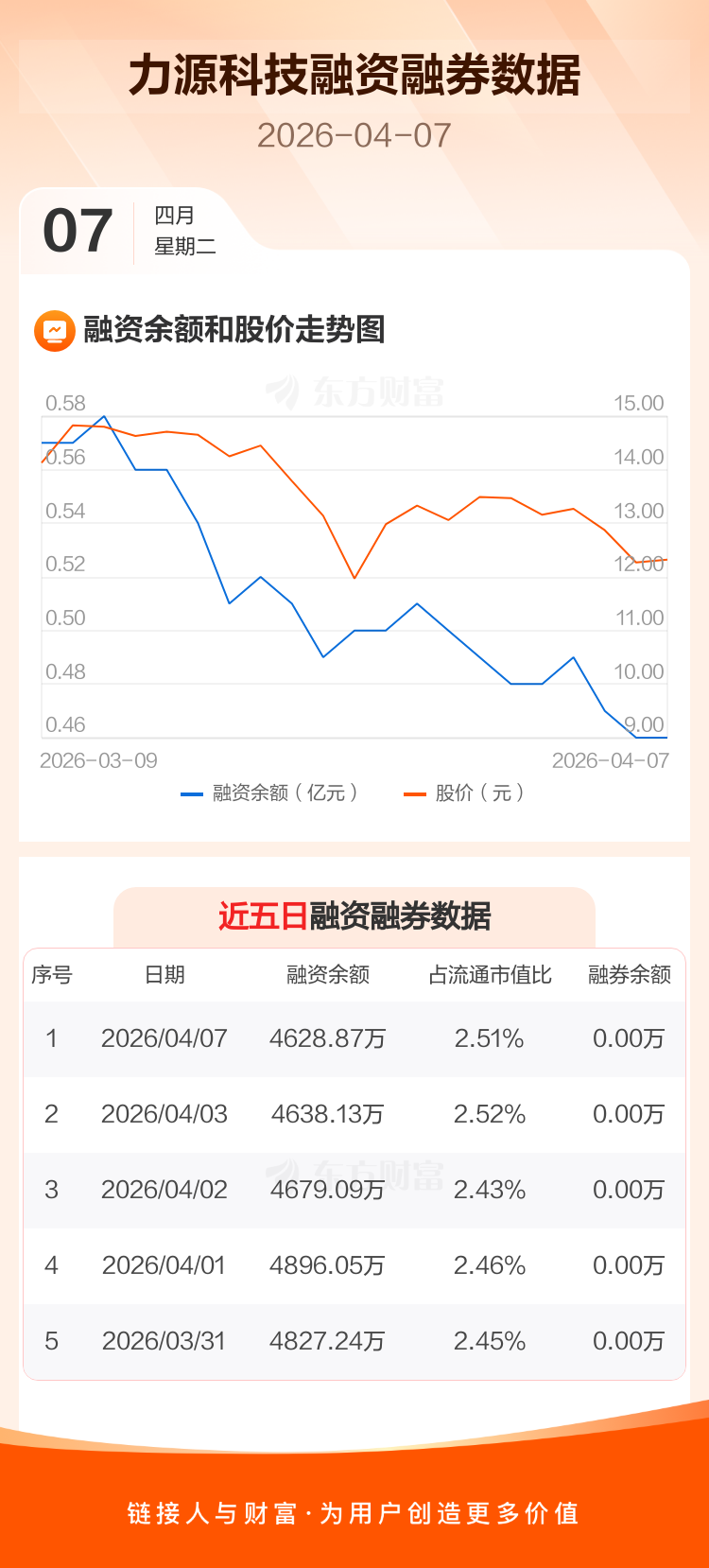 交易所最新数据显示,力源科技于2026年4月7日获融资买入331.03万元,融资偿还340.29万元,当日融资净偿还9.26万元。目前,该股融资余额4628.87万,占流通市值比例为2.51%。