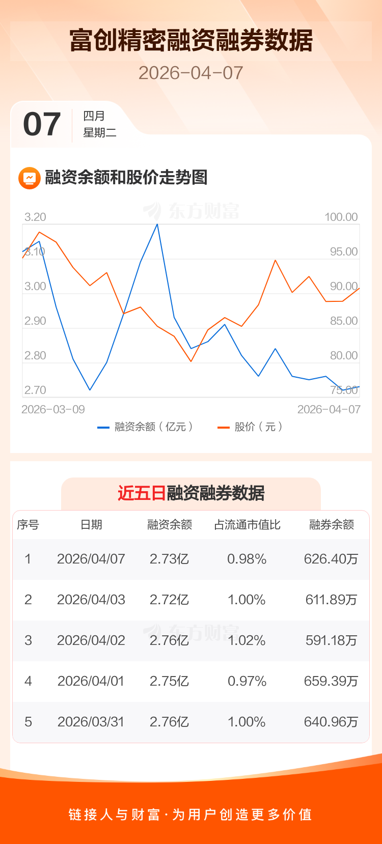 交易所最新数据显示,富创精密于2026年4月7日获融资买入1997.52万元,融资偿还1876.58万元,当日融资净买入120.93万元。目前,该股融资余额2.73亿,占流通市值比例为0.98%。