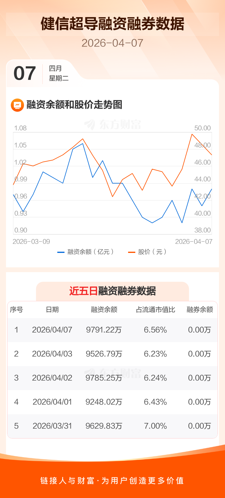 交易所最新数据显示,健信超导于2026年4月7日获融资买入1551.28万元,融资偿还1286.84万元,当日融资净买入264.44万元。目前,该股融资余额9791.22万,占流通市值比例为6.56%。