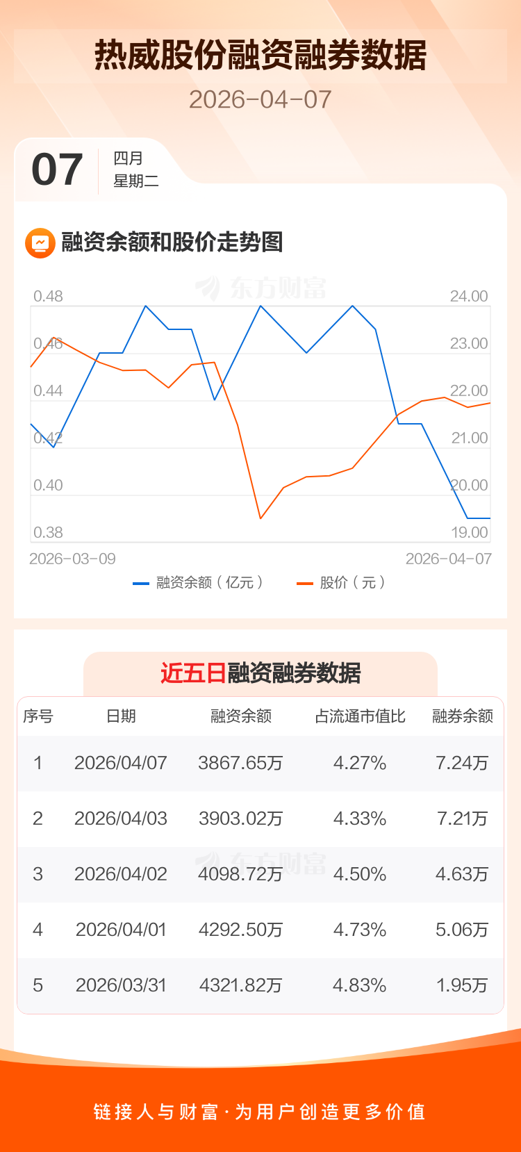 交易所最新数据显示,热威股份于2026年4月7日获融资买入194.50万元,融资偿还229.87万元,当日融资净偿还35.37万元。目前,该股融资余额3867.65万,占流通市值比例为4.27%。