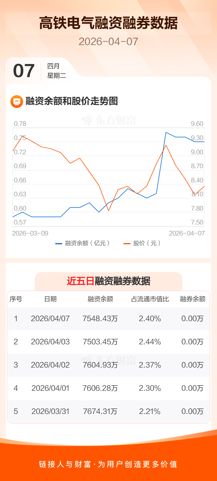 交易所最新数据显示,高铁电气于2026年4月7日获融资买入532.17万元,融资偿还487.18万元,当日融资净买入44.98万元。目前,该股融资余额7548.43万,占流通市值比例为2.40%。