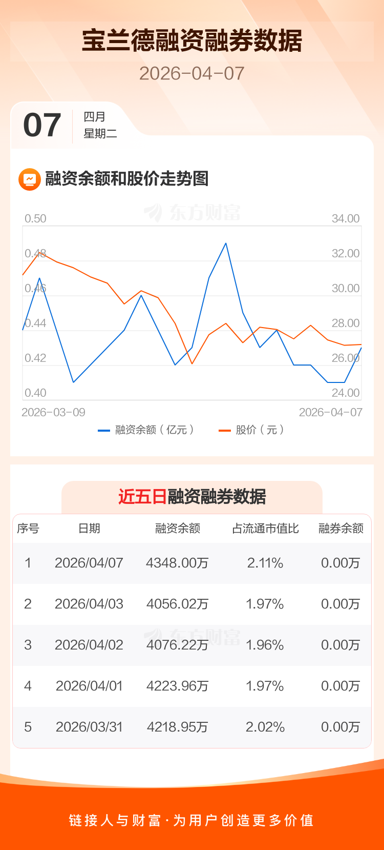 交易所最新数据显示,宝兰德于2026年4月7日获融资买入496.79万元,融资偿还204.81万元,当日融资净买入291.98万元。目前,该股融资余额4348.00万,占流通市值比例为2.11%。