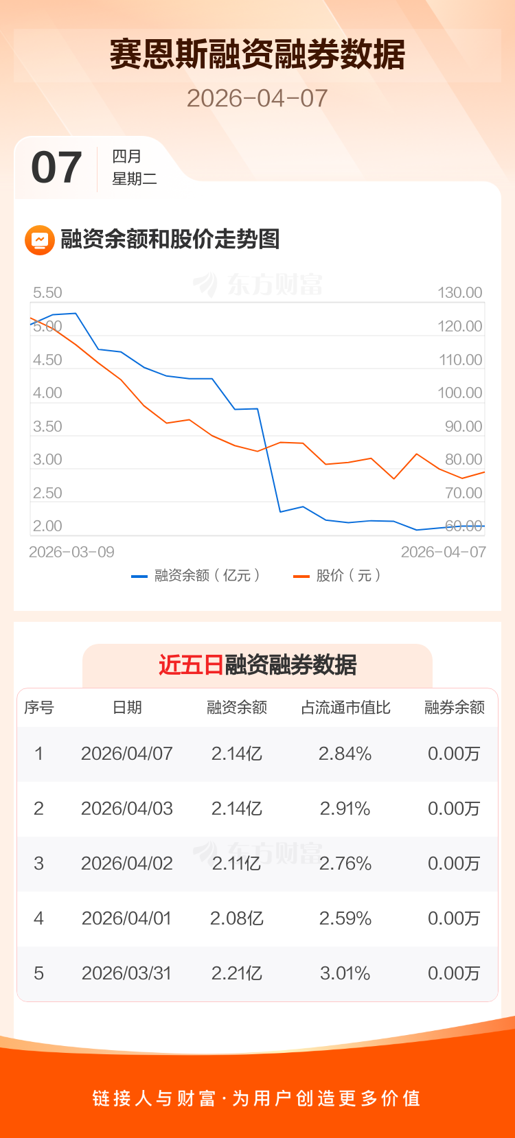 交易所最新数据显示,赛恩斯于2026年4月7日获融资买入1893.48万元,融资偿还1886.18万元,当日融资净买入7.29万元。目前,该股融资余额2.14亿,占流通市值比例为2.84%。
