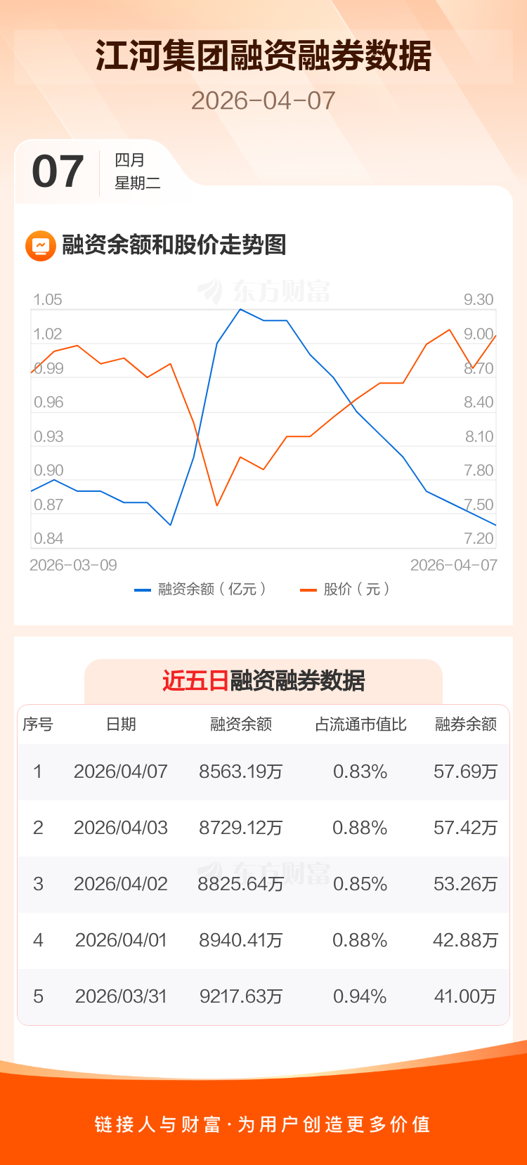 交易所最新数据显示,江河集团于2026年4月7日获融资买入328.98万元,融资偿还494.91万元,当日融资净偿还165.93万元。目前,该股融资余额8563.19万,占流通市值比例为0.83%。