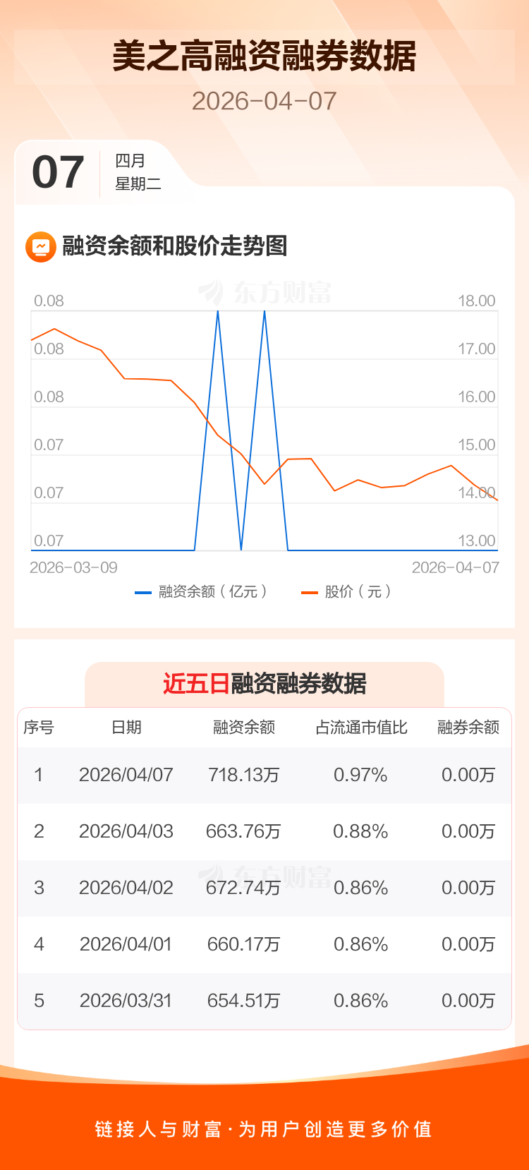 交易所最新数据显示,美之高于2026年4月7日获融资买入63.06万元,融资偿还8.69万元,当日融资净买入54.37万元。目前,该股融资余额718.13万,占流通市值比例为0.97%。