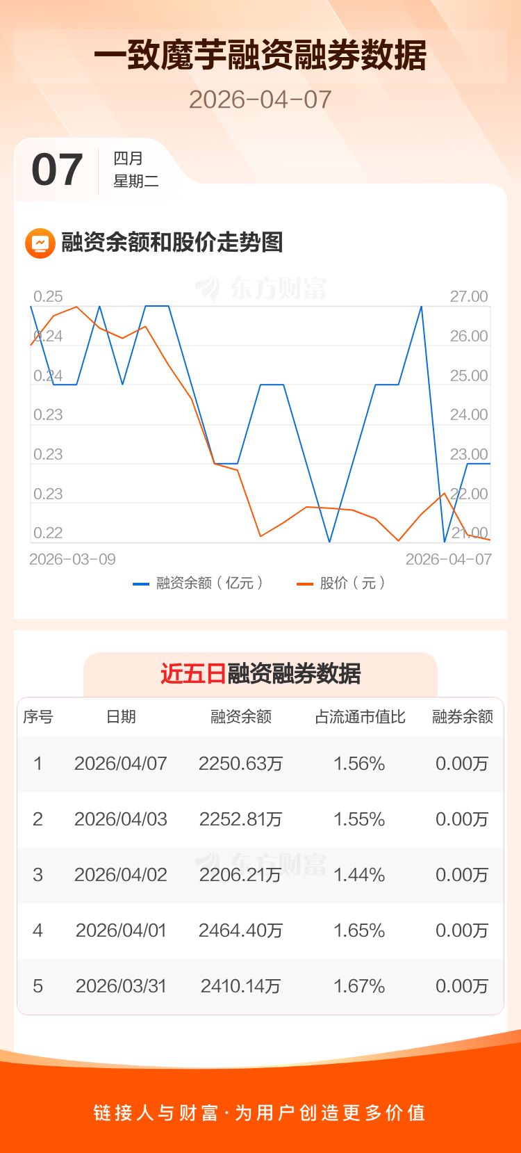 交易所最新数据显示,一致魔芋于2026年4月7日获融资买入31.06万元,融资偿还33.25万元,当日融资净偿还2.19万元。目前,该股融资余额2250.63万,占流通市值比例为1.56%。