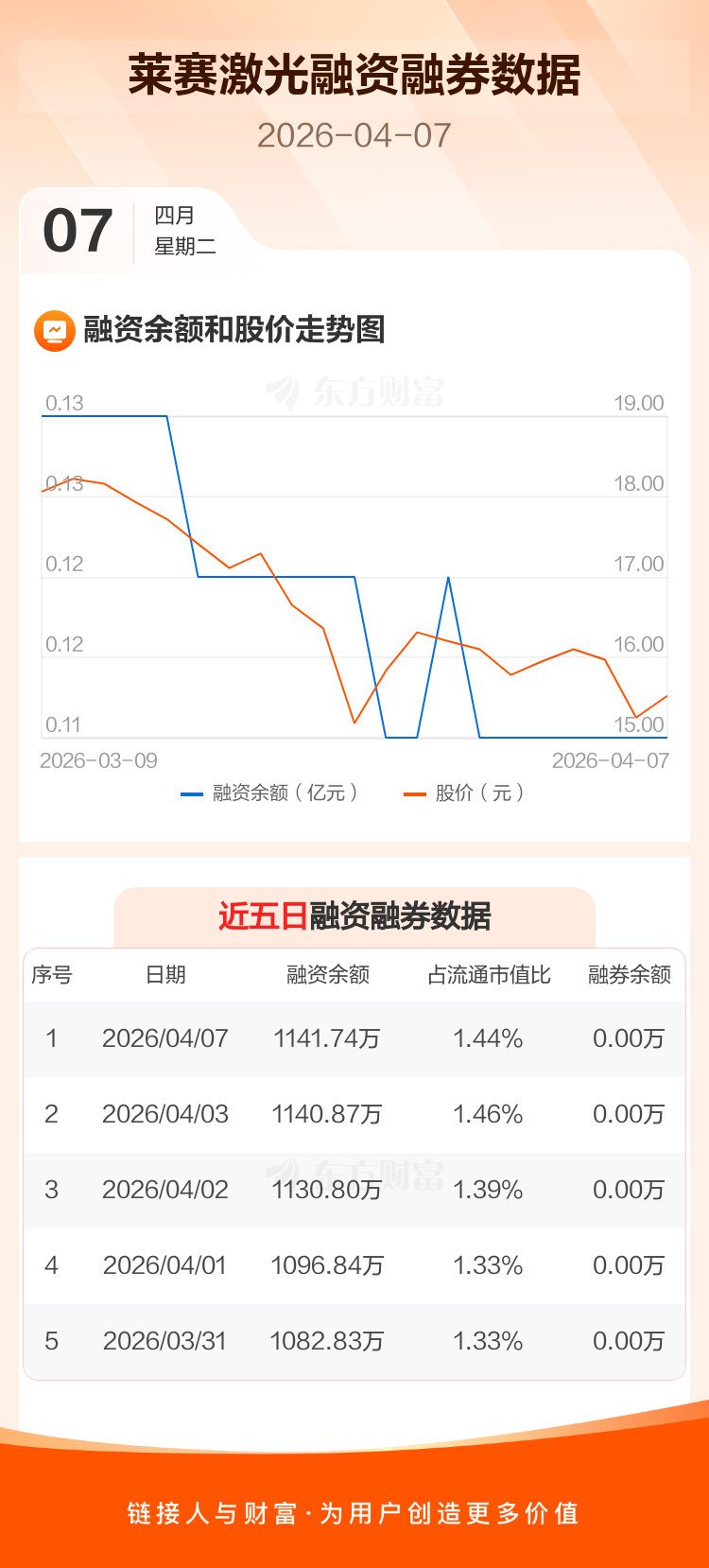 交易所最新数据显示,莱赛激光于2026年4月7日获融资买入6.69万元,融资偿还5.82万元,当日融资净买入8636元。目前,该股融资余额1141.74万,占流通市值比例为1.44%。
