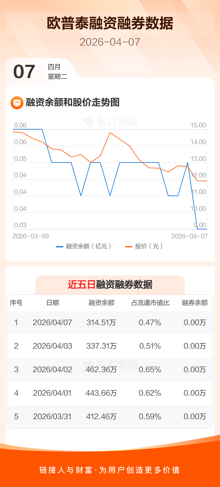交易所最新数据显示,欧普泰于2026年4月7日获融资买入5.77万元,融资偿还28.58万元,当日融资净偿还22.81万元。目前,该股融资余额314.51万,占流通市值比例为0.47%。