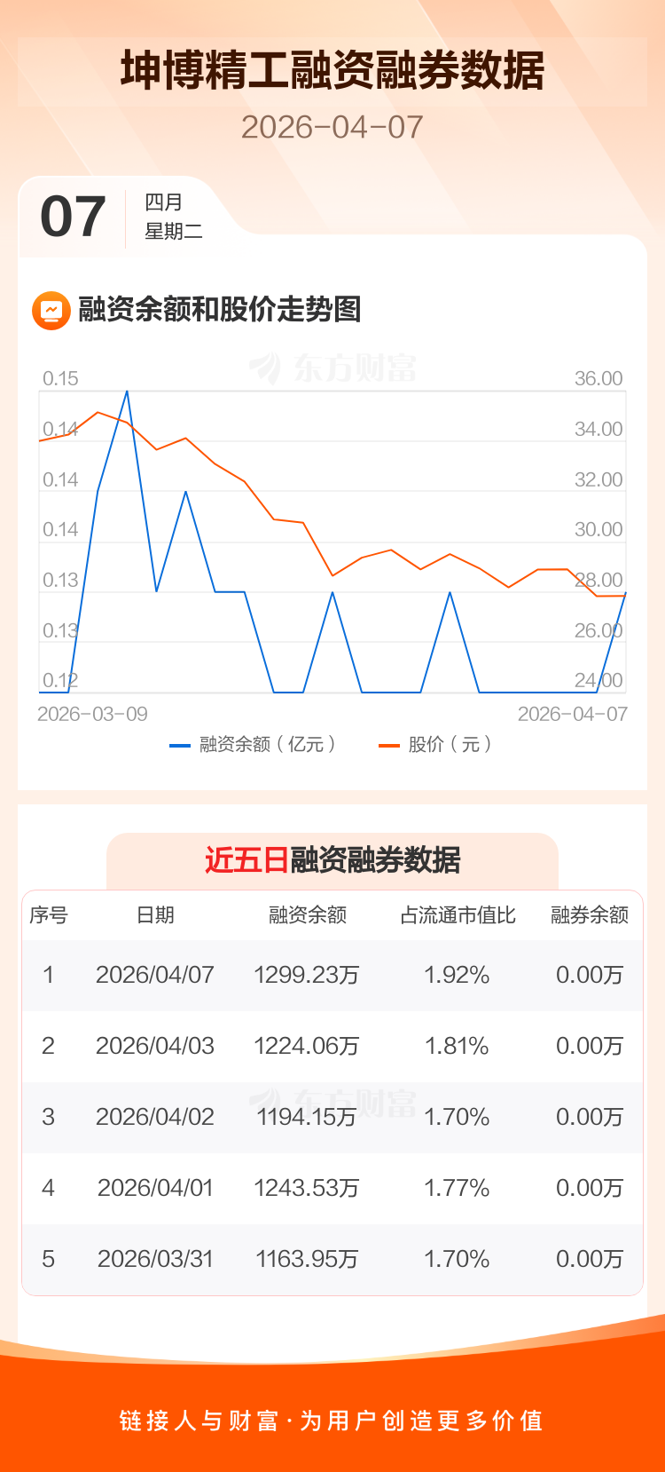 交易所最新数据显示,坤博精工于2026年4月7日获融资买入95.43万元,融资偿还20.26万元,当日融资净买入75.16万元。目前,该股融资余额1299.23万,占流通市值比例为1.92%。