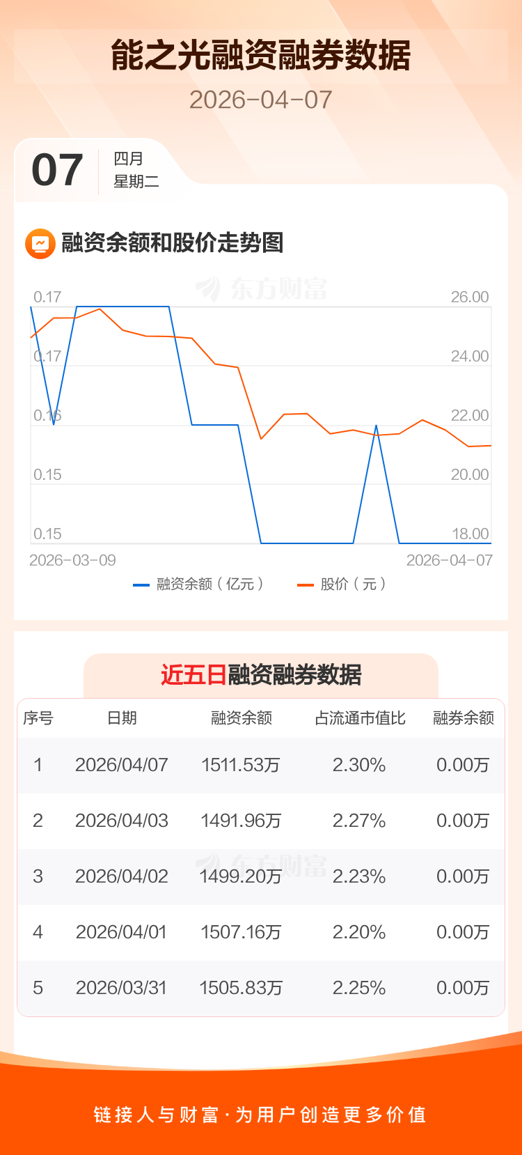 交易所最新数据显示,能之光于2026年4月7日获融资买入20.66万元,融资偿还1.08万元,当日融资净买入19.57万元。目前,该股融资余额1511.53万,占流通市值比例为2.30%。