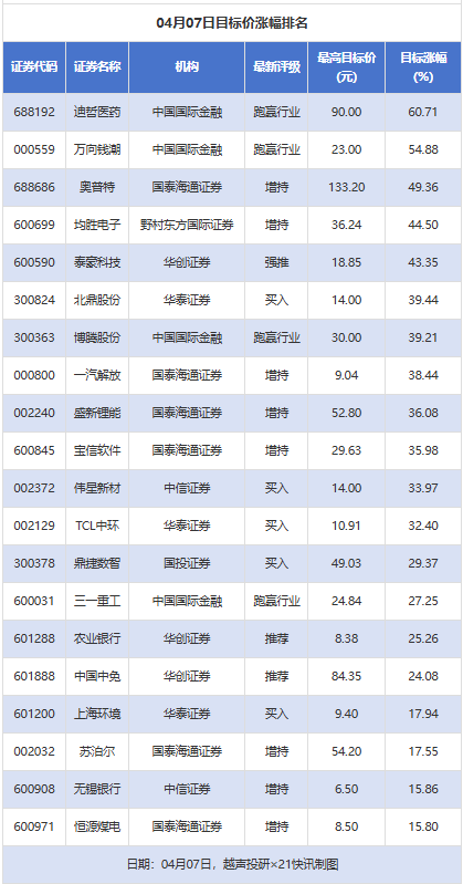 越声投研数据显示,4月7日,券商给予上市公司目标价共28次,按最新收盘价计算,目标价涨幅排名居前的公司有迪哲医药、万向钱潮、奥普特,目标价涨幅分别为60.71%、54.88%、49.36%,分别属于化学制药、汽车零部件、自动化设备行业。