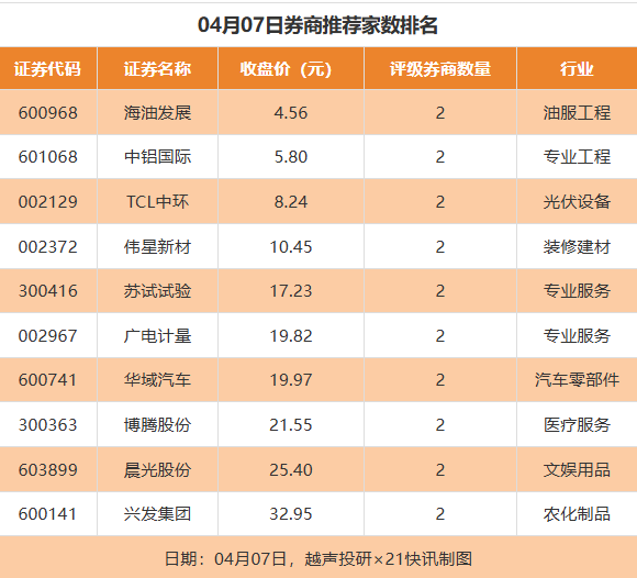 从券商推荐家数来看,4月7日有101家上市公司得到券商推荐,其中海油发展、中铝国际、TCL中环等获得2家推荐。