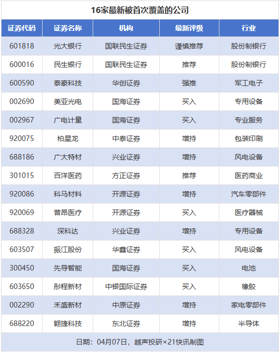 首次覆盖方面,4月7日券商共给出了16次首次覆盖,其中光大银行、民生银行获得国联民生证券分别给予“谨慎推荐”“推荐”评级,泰豪科技获得华创证券给予“强推”评级,美亚光电、广电计量获得国海证券给予“买入”评级。