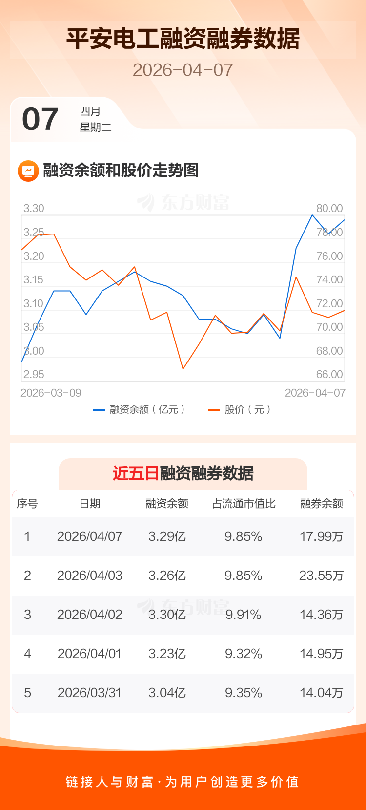 交易所最新数据显示,平安电工于2026年4月7日获融资买入760.53万元,融资偿还491.45万元,当日融资净买入269.07万元。目前,该股融资余额3.29亿,占流通市值比例为9.85%。