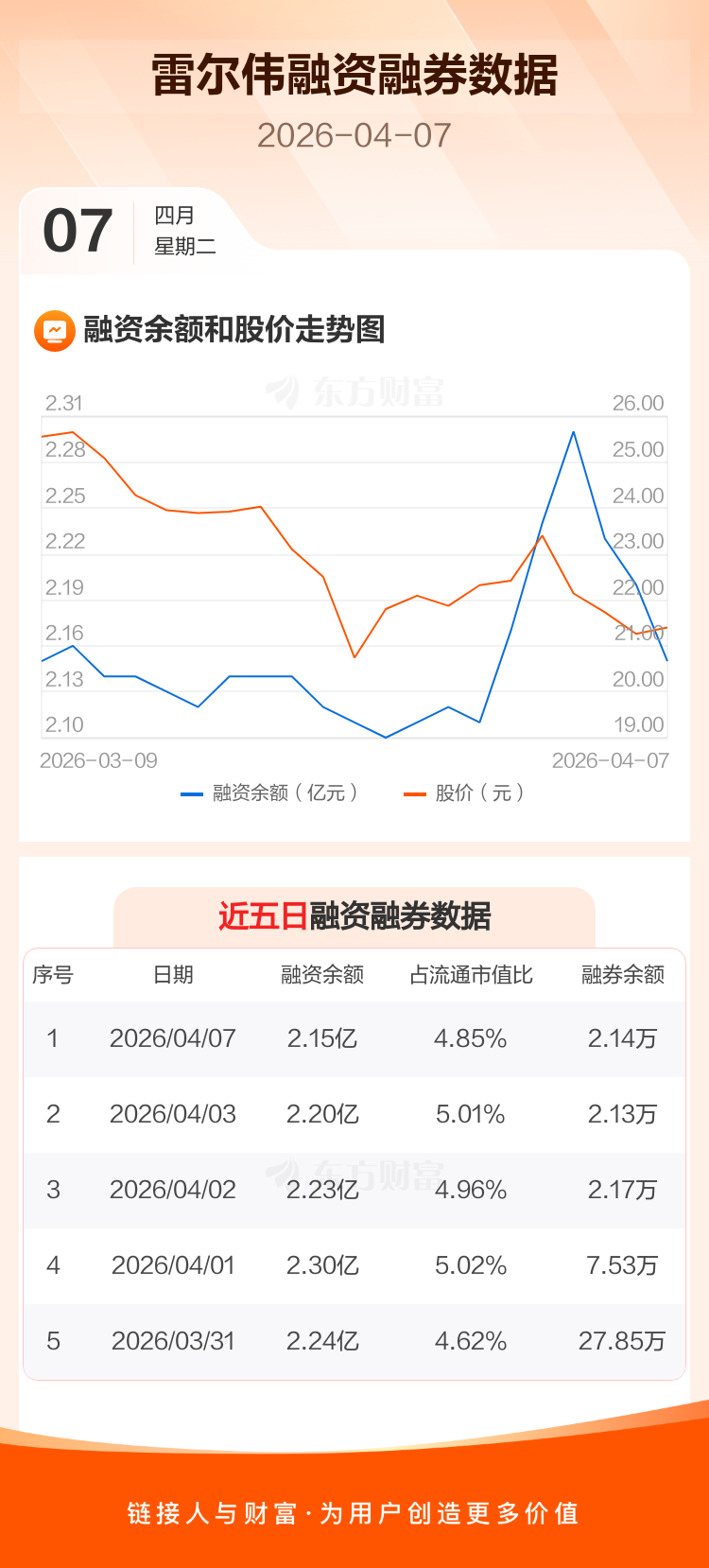 交易所最新数据显示,雷尔伟于2026年4月7日获融资买入296.64万元,融资偿还842.07万元,当日融资净偿还545.43万元。目前,该股融资余额2.15亿,占流通市值比例为4.85%。