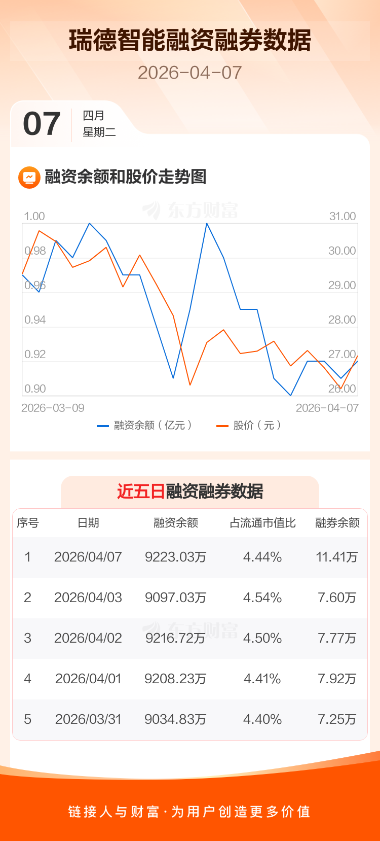 交易所最新数据显示,瑞德智能于2026年4月7日获融资买入505.35万元,融资偿还379.36万元,当日融资净买入125.99万元。目前,该股融资余额9223.03万,占流通市值比例为4.44%。