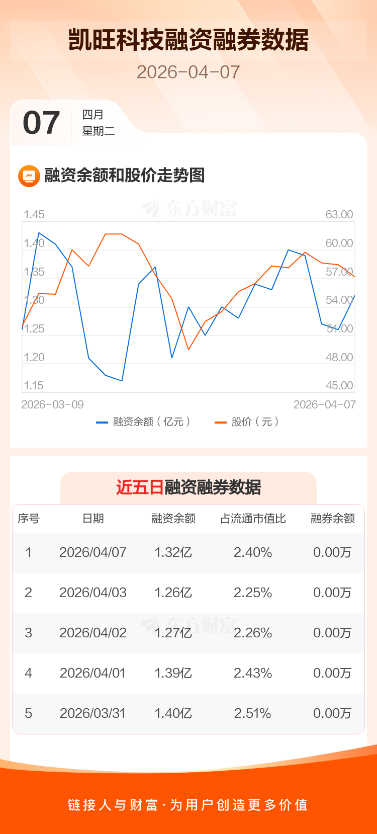 交易所最新数据显示,凯旺科技于2026年4月7日获融资买入3634.10万元,融资偿还3079.34万元,当日融资净买入554.76万元。目前,该股融资余额1.32亿,占流通市值比例为2.40%。