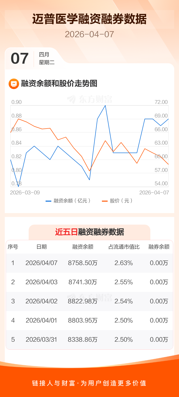 交易所最新数据显示,迈普医学于2026年4月7日获融资买入661.00万元,融资偿还643.80万元,当日融资净买入17.19万元。目前,该股融资余额8758.50万,占流通市值比例为2.63%。
