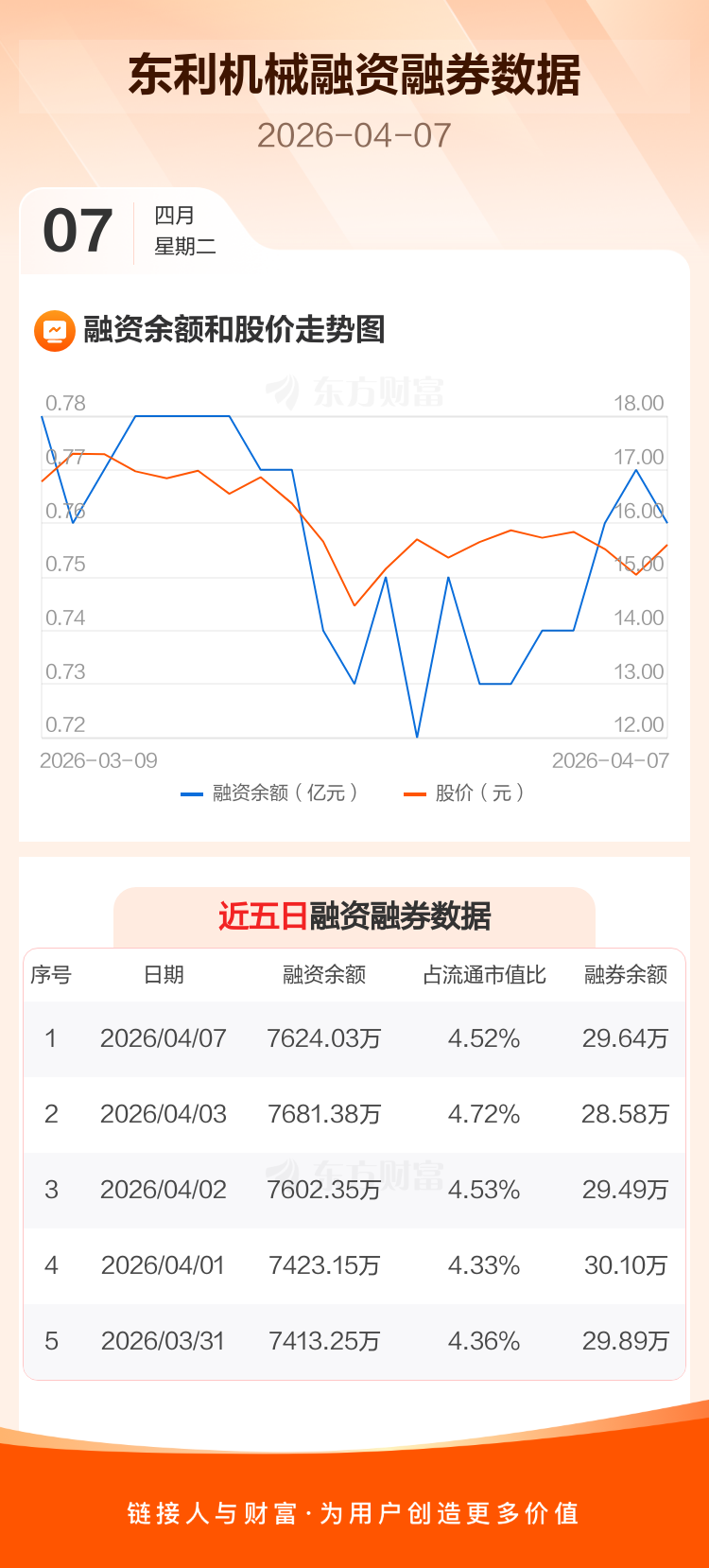 交易所最新数据显示,东利机械于2026年4月7日获融资买入333.66万元,融资偿还391.01万元,当日融资净偿还57.35万元。目前,该股融资余额7624.03万,占流通市值比例为4.52%。