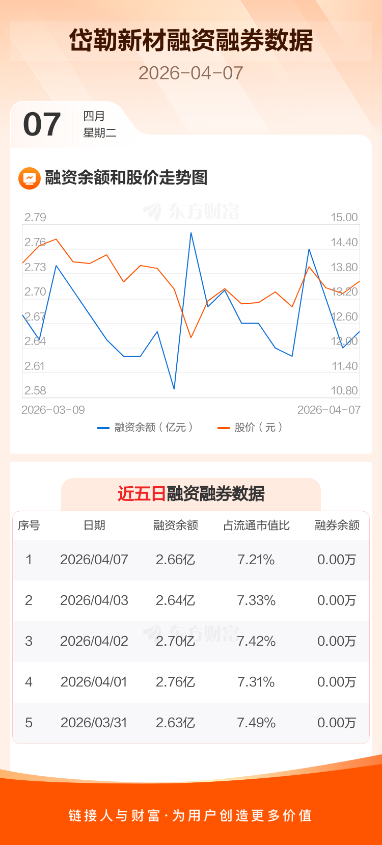 交易所最新数据显示,岱勒新材于2026年4月7日获融资买入1941.46万元,融资偿还1772.66万元,当日融资净买入168.8万元。目前,该股融资余额2.66亿,占流通市值比例为7.21%。