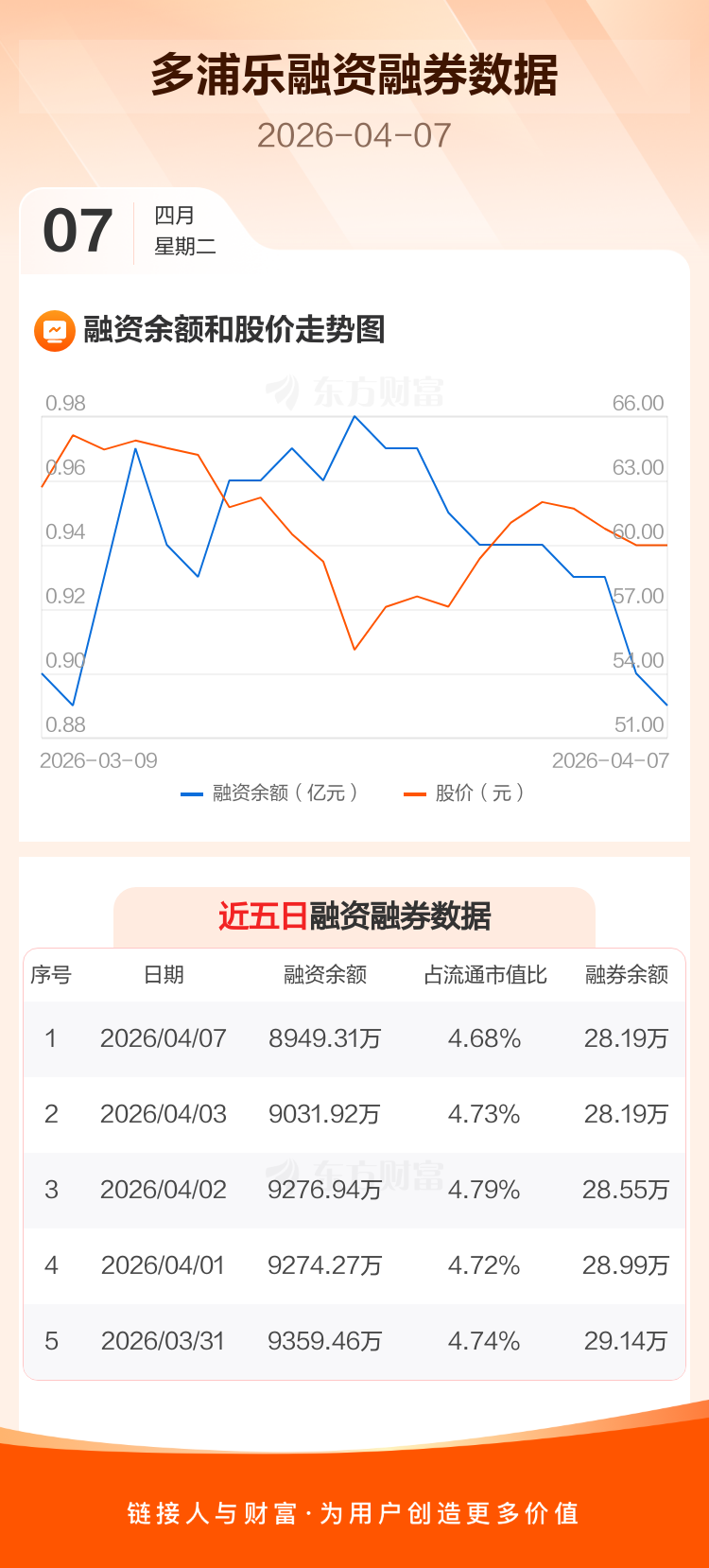 交易所最新数据显示,多浦乐于2026年4月7日获融资买入135.51万元,融资偿还218.11万元,当日融资净偿还82.6万元。目前,该股融资余额8949.31万,占流通市值比例为4.68%。