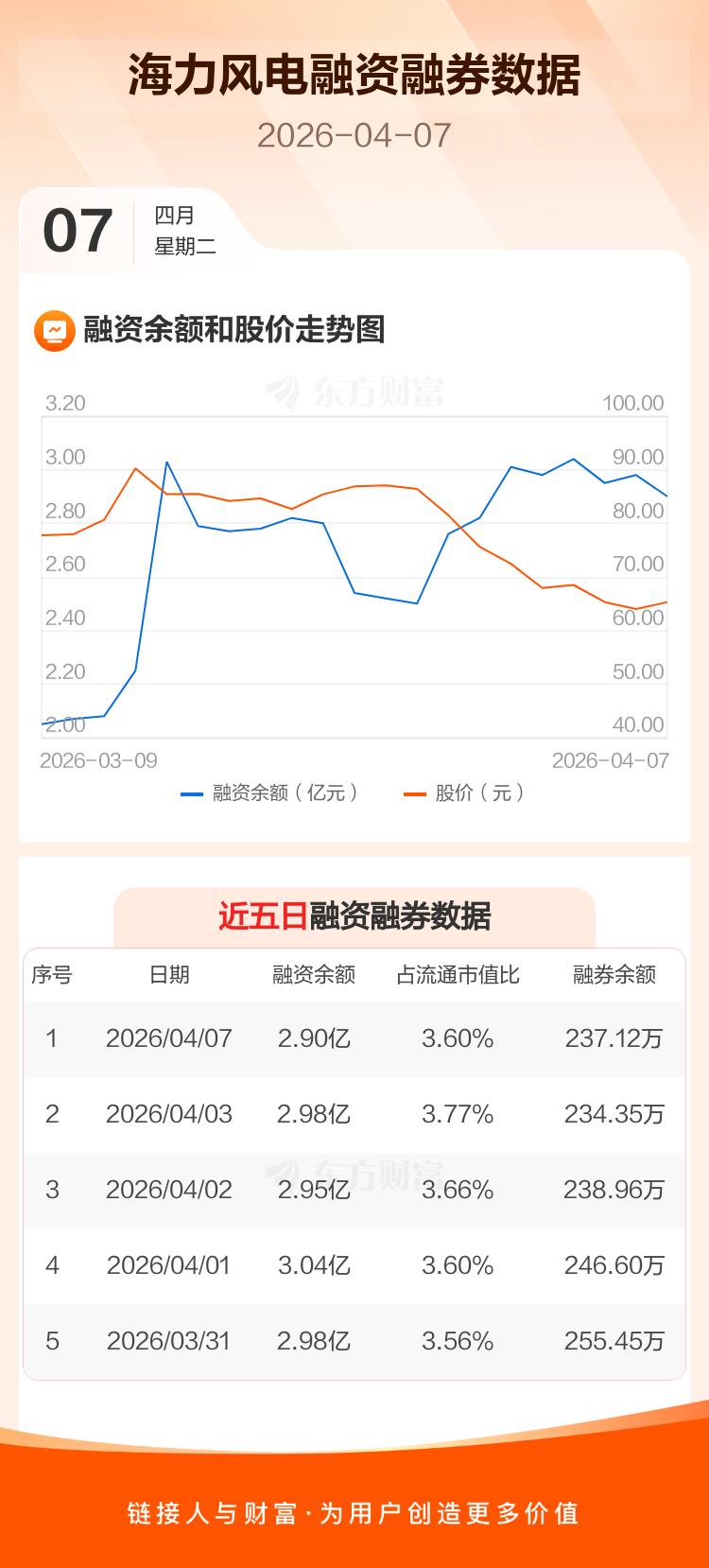 交易所最新数据显示,海力风电于2026年4月7日获融资买入1654.47万元,融资偿还2464.72万元,当日融资净偿还810.25万元。目前,该股融资余额2.90亿,占流通市值比例为3.60%。