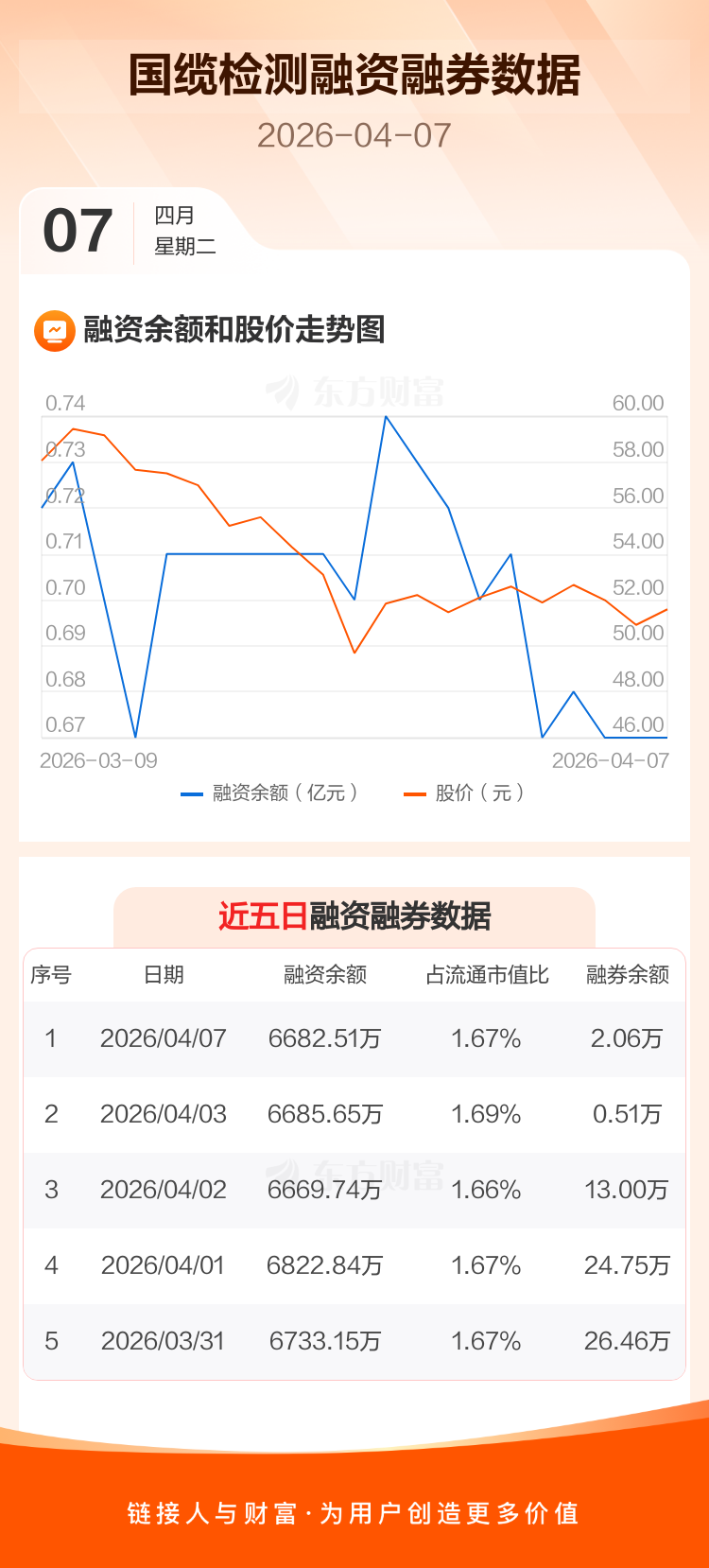 交易所最新数据显示,国缆检测于2026年4月7日获融资买入227.83万元,融资偿还230.97万元,当日融资净偿还3.14万元。目前,该股融资余额6682.51万,占流通市值比例为1.67%。
