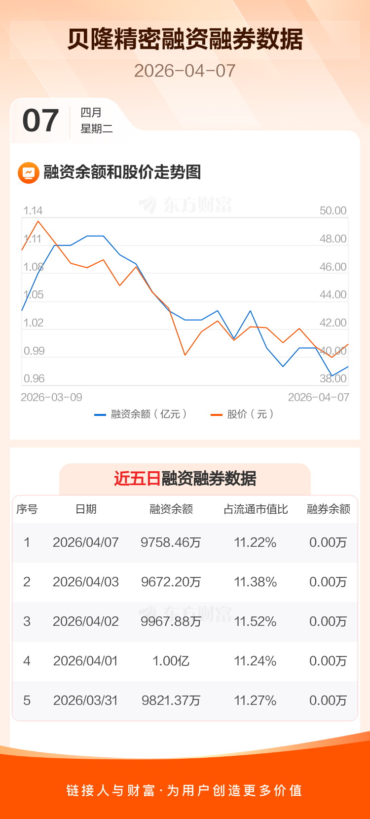 交易所最新数据显示,贝隆精密于2026年4月7日获融资买入436.43万元,融资偿还350.17万元,当日融资净买入86.26万元。目前,该股融资余额9758.46万,占流通市值比例为11.22%。