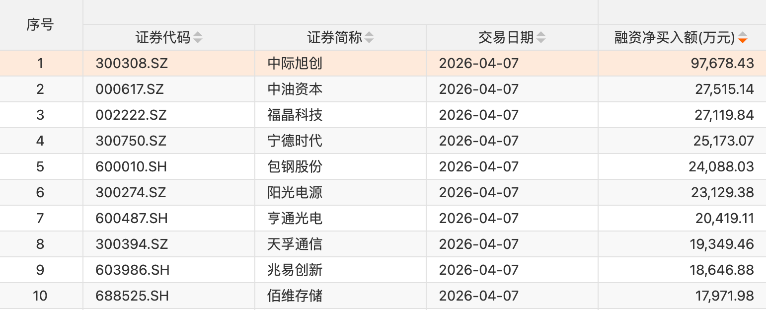 个股方面,21只个股获融资净买入额超1亿元。中际旭创获融资净买入额居首,净买入9.77亿元;融资净买入额居前的还有中油资本、福晶科技、宁德时代、包钢股份、阳光电源、亨通光电、天孚通信、兆易创新、佰维存储。
