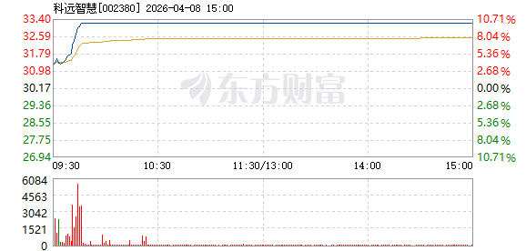 4月8日9点45分,科远智慧盘中涨停,报33.19元,目前封单124004手,折合4.12亿元。截至目前,成交1.08亿元,换手率2.36%。