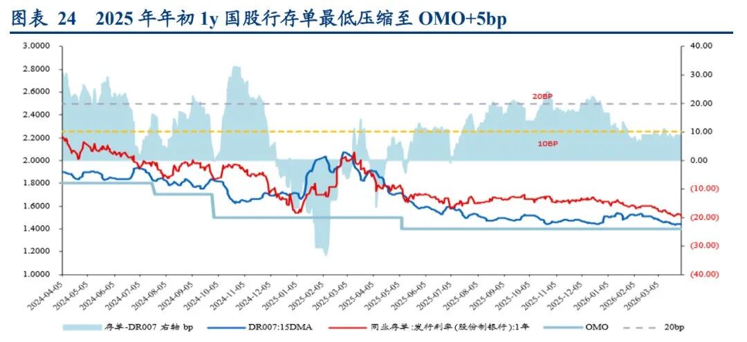按照OMO利率+5bp考虑,存单是否降至下限?监管影响弱于上轮;资金状态更宽松;当前DR007价格短暂低于1.4%,套息空间放大成为短期行情驱动,但随着OMO持续回笼,预计DR007较难持续低于1.4%。整体来看,短期监管影响释放,叠加资金价格进一步宽松的空间有限,存单1.45%或也为相对下限。不过,在整体宽松的格局下,短期存单等短端资产或处于低位运行,后续重点关注资金价格的运行状态。