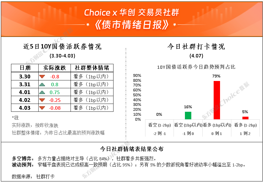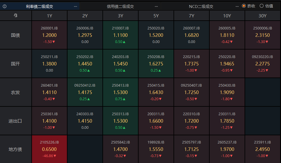 行情复盘:截至今日17:30,利率市场收益率多数下行,10Y国债下行0.32bp至1.81%,30Y国债下行1.2bp至2.32%。信用市场收益率多数下行,2Y期AAA信用债下行1bp至1.52%。债市早盘上涨。中国央行开展5亿元7天期逆回购、8000亿元买断式逆回购操作,净投放4985亿元。资金面宽松,资金情绪指数44,资金价格较昨日震荡,DR001在1.21%附近,DR007在1.34%附近。 当天基金为买方主力,银行呈卖出趋势,基金跟随行情变动多空分歧较大。