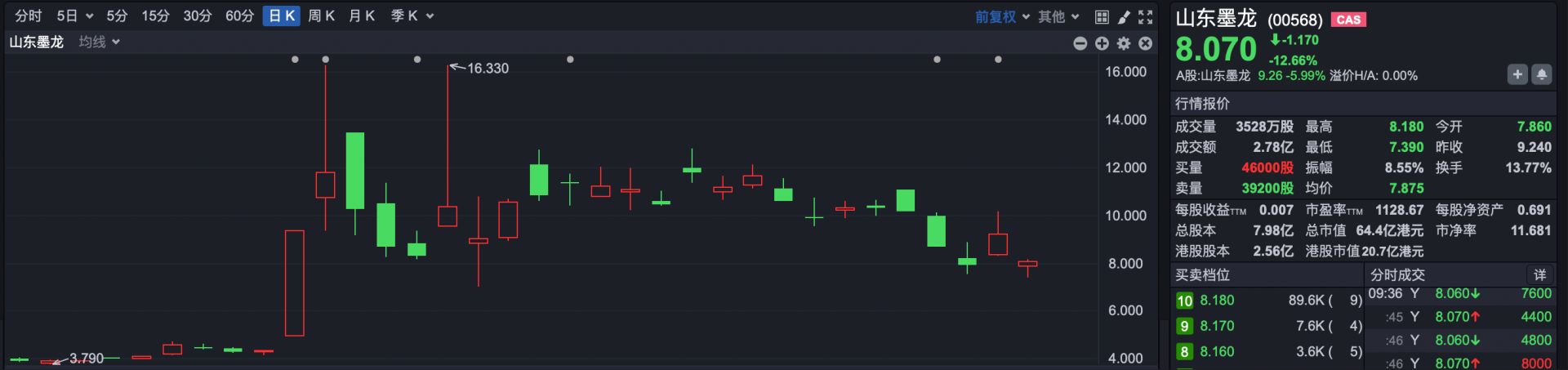受国际油价大跌影响,油气股全线走弱,山东墨龙早盘跌超12%。