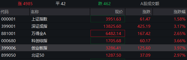 【大河财立方消息】4月8日,A股主要指数集体高开,创业板指盘中涨超4%。截至发稿,上证指数涨1.58%,深证成指涨3.17%,科创综指涨3.66%,创业板指涨3.97%,全市场近5000只个股上涨。