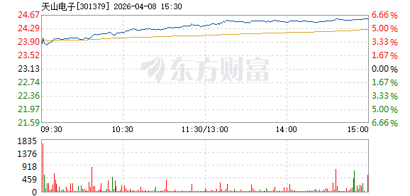 4月8日,天山电子盘中涨幅达5%,截至11点01分,报24.3元,成交4369.64万元,换手率1.43%。