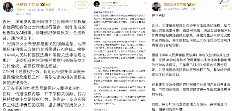 4月6日,张婧仪、邓为、龚俊工作室接连发布抵制AI短剧侵权声明,称部分网络平台未经授权擅自使用其肖像,制作和传播AI剧集,要求停止侵权并下架相关视频。