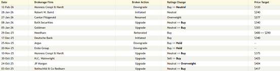 进入2026年,随着Q4业绩出炉和加密市场调整,机构评级出现明显分化:Monness Crespi & Hardt将目标价下调至120美元,成为最悲观的声音;而Cantor Fitzgerald和高盛、美银则在1月底依然维持增持/买入评级,目标价在277-340美元区间。