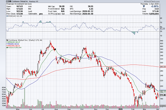 COIN当前股价约171美元(截至2026年4月2日收盘),市值约382亿美元,市盈率(P/E)约38.6倍(基于当前EPS 4.45美元)。